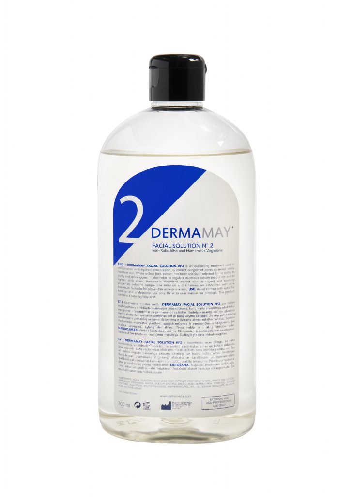 Kosmetinis tirpalas veidui „Dermamay Facial Solution No. 2“ yra skirtas eksfoliacinėms ir hidrodermabrazijos procedūroms, kurių metu atveriamos užsikimšusios poros ir pastebimai pagerinama odos būklė. Tinka riebiai ir į aknę linkusiai odai.